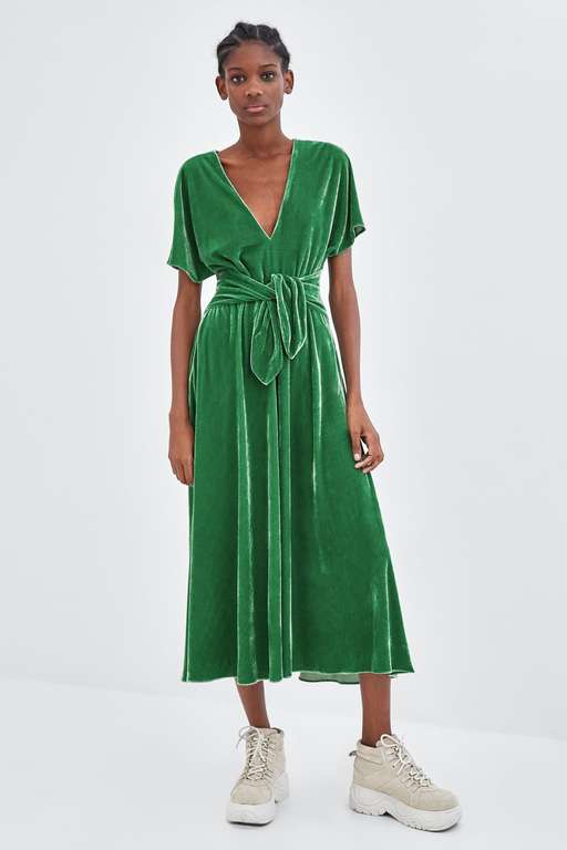 El repaso a los vestidos de fiesta para bodas Zara Primavera Verano culmina con este vestido midi de terciopelo. Ideal para la temporada, cuenta con escote de pico y manga corta con vuelo. Además de la lazada delantera, tiene bolsillos en los laterales. Lo tienes en Zara por 39,95 euros.