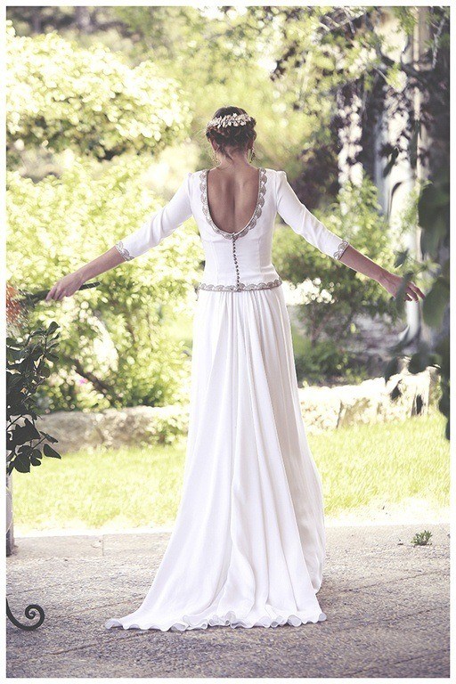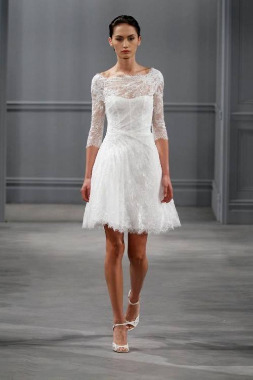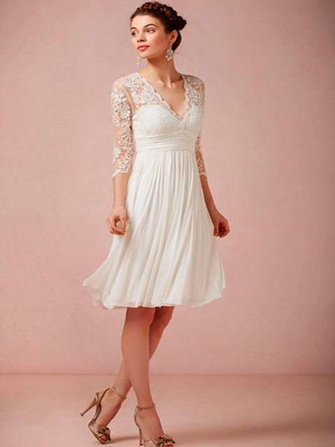 Una de las opciones más sencillas que te podemos mostrar está en la fotografía que ves arriba. Se trata de un vestido de novia corto, ideal para las boda civiles y los más utilizados en estas ocasiones, liso y con un pequeño detalle en la cintura. Por otro lado, en la fotografía de abajo te mostramos algo más formal, con un escote en uve precioso y con mangas llenas de bordados y encaje.