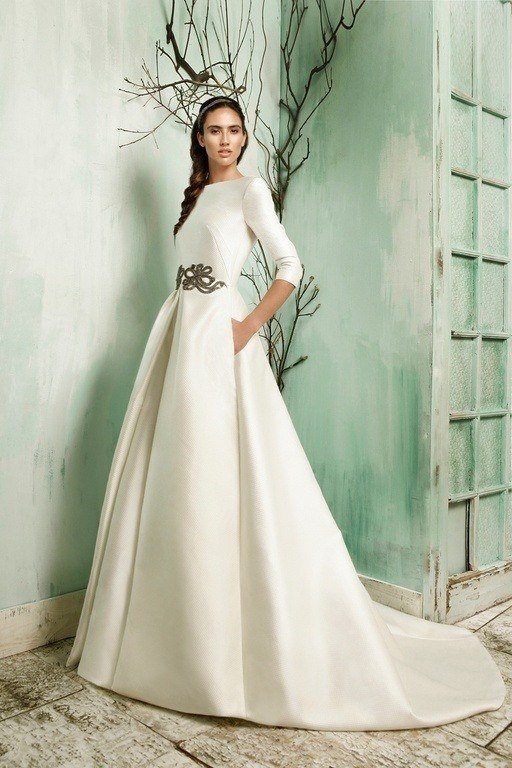 En esta otra imagen vemos un modelo de vestido de novia ibicenco de Yolan Cris, aunque con un aire renovado y muy moderno, ya que se distingue por el uso de bolsillos como de hecho vemos en otros muchos modelos de vestidos de novia para este.