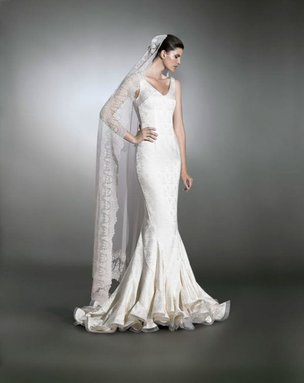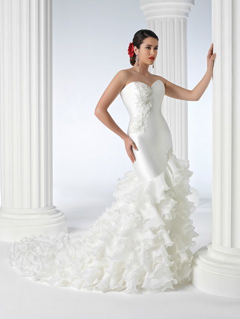 Puedes elegir un vestido de novia gitana y flamenco al uso, como sería el de la fotografía de abajo, que se caracteriza por una larga cola con volantes, así como por ser un vestido muy ceñido al cuerpo para marcar la figura; pero si quieres algo más discreto que mezcle lo clásico con lo flamenco, optar por un vestido como el que ves en la fotografía de arriba: con algo de volante en la cola y ceñido al cuerpo, acompañado por un velo que hace de mantilla.