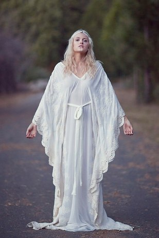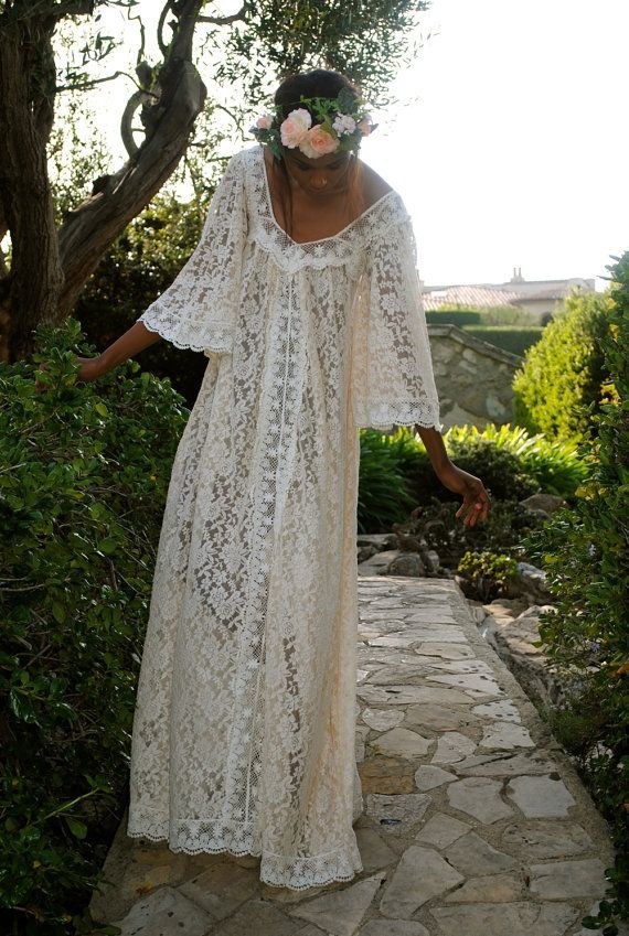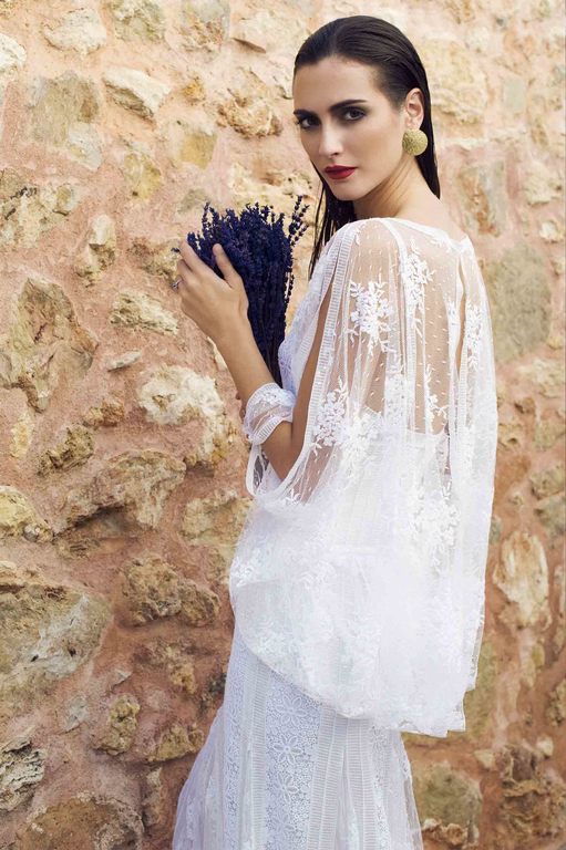 Un vestido que recoge toda la esencia del movimiento hippy, vestidos cómodos confeccionados en tejidos naturales y mas o menos sueltos. Todo lo que la estética hippy reclama, se trata de un original vestido de novia confeccionado en encaje de corte chilaba. Un precioso vestido con mangas de capa larga y bajo con volante.