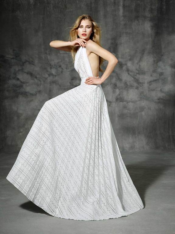 Este maravilloso vestido de novia con un estilo muy boho chic, confeccionado en precioso encaje blanco con plisado soleil artesanal. El escote tipo halter tiene una bonita abertura en forma triangular. Diseño de lineas puras con espalda al descubierto que conserva el inconfundible estilo bohemio de Yolan Cris.