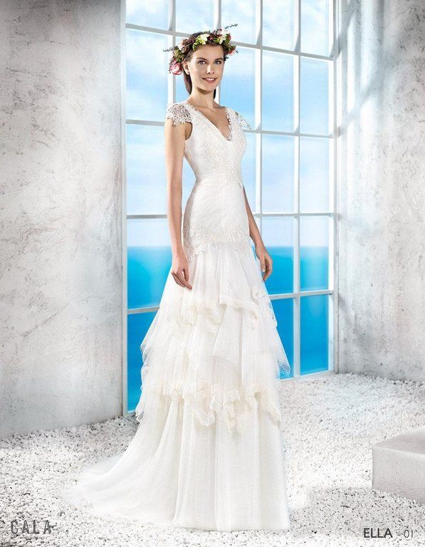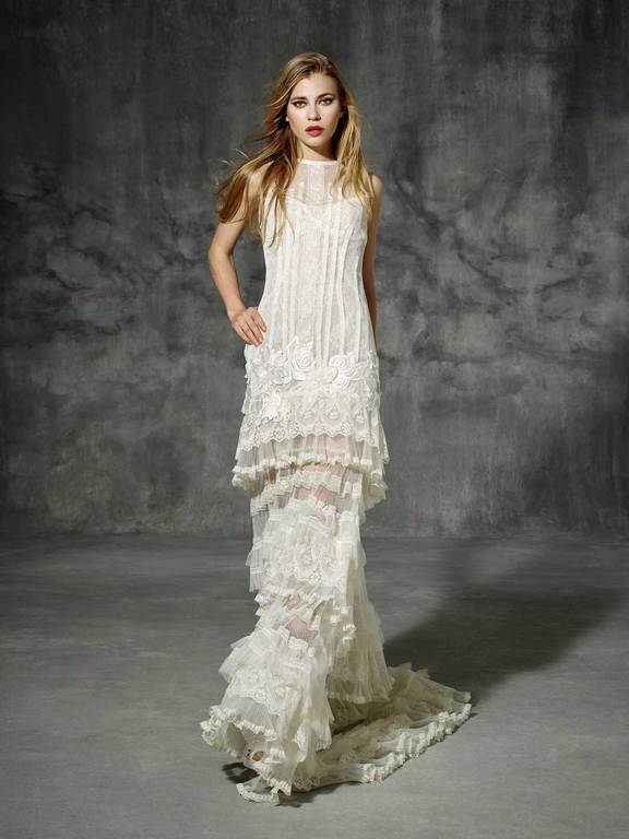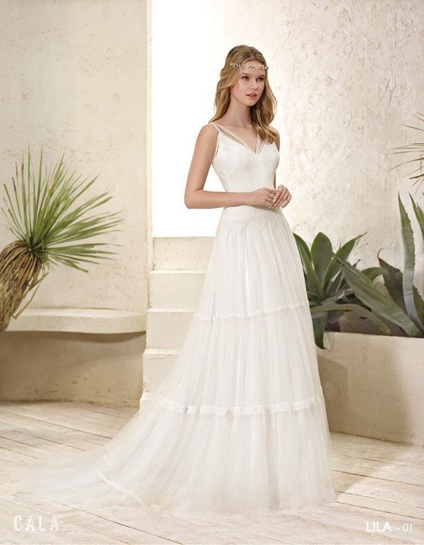 un estilo sencillo, recordando el más puro estilo ibicenco. Podemos ver el gran faldón lleno de tul, con mucha ligereza y con pequeños toques de encajes en la parte del corpiño, para darle el contraste que necesita.