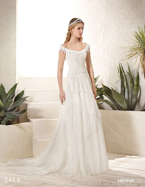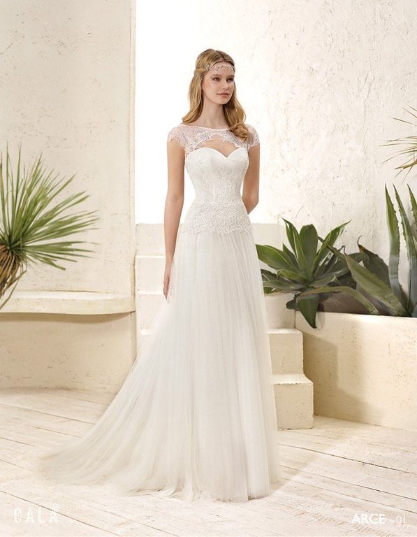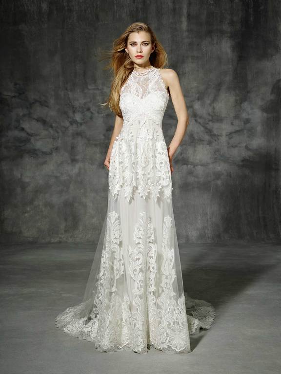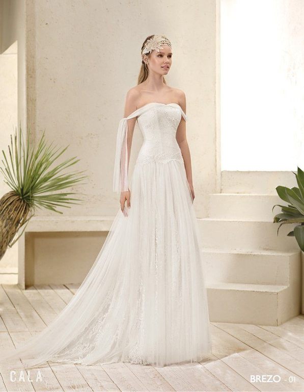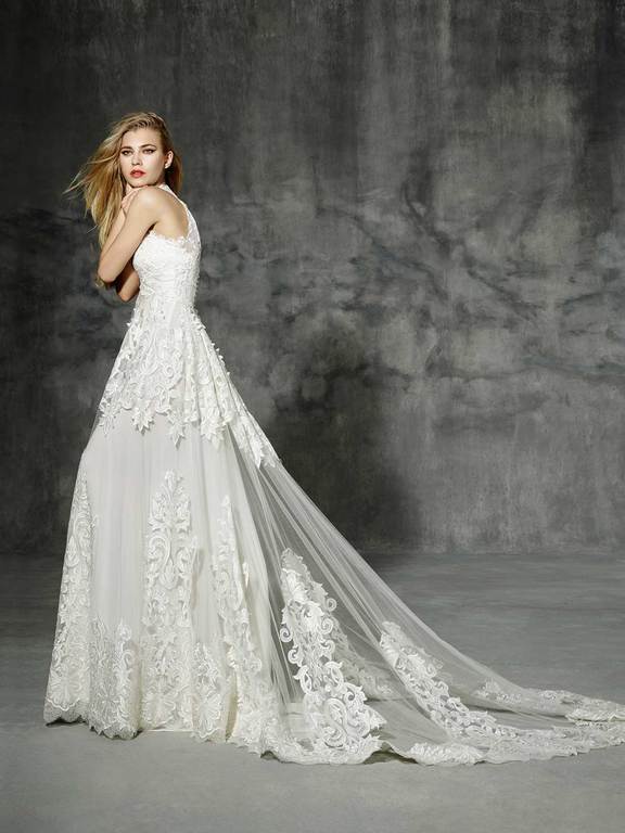 Vestido confeccionado en tejido de tul con bordado con motivos naturales confeccionado en guipur de seda, para acabar con una maravillosa cola en forma de abanico. Ideal para una novia más clásica.
