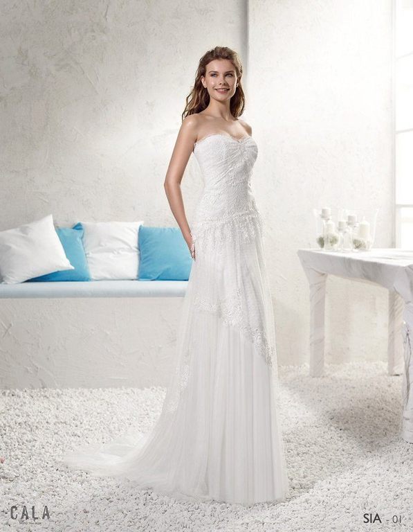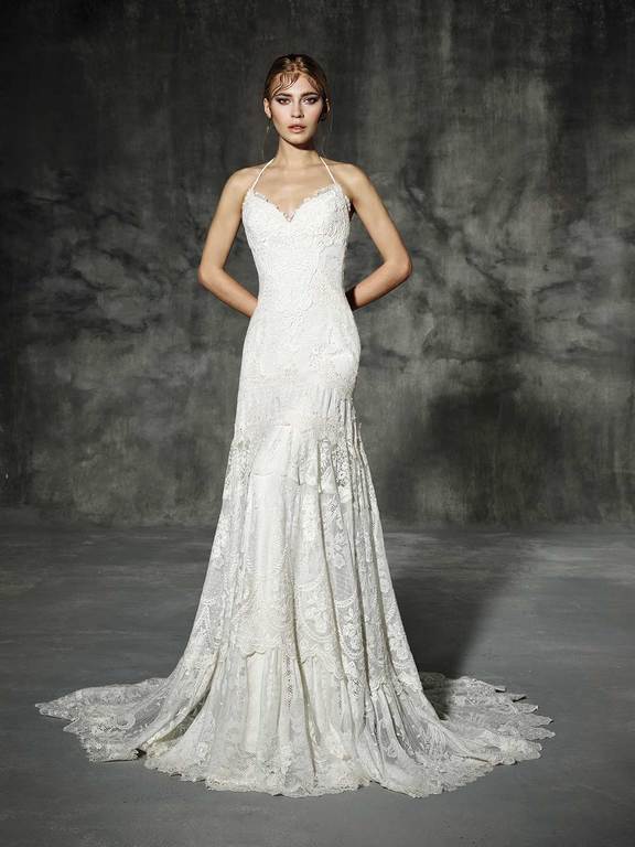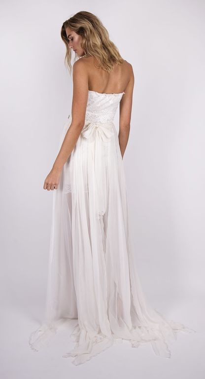 Un vestido confeccionado en encaje, con escote palabra de honor y ajustado al contorno del cuerpo, de la cintura parte una maravillosa falda de suave caída confeccionada en chiffon color champagne, ajustada a la espalda mediante un lazo. Un vestido pensado para que sea la atmósfera la que juegue con los tejidos.