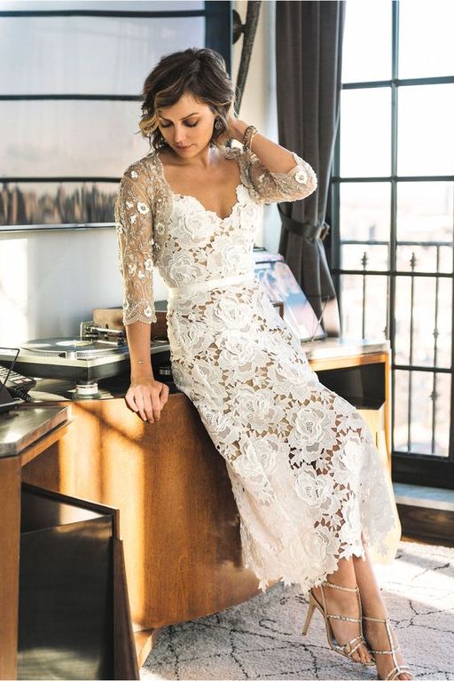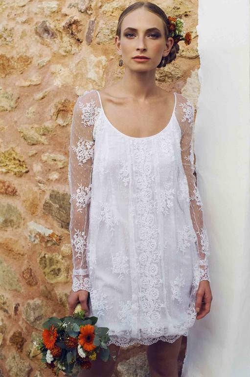 Otra bonita opción, rompiendo con el clásico vestido de corte ibicenco o hippy, se trata de un mono corto, confeccionado por entero en encaje, de manga larga y cuello redondo, un vestido de novia diferente, para una mujer segura de si misma, que sabe lo que quiere y lo que quiere es un vestido cómodo con el que no sentirse encorsetado.