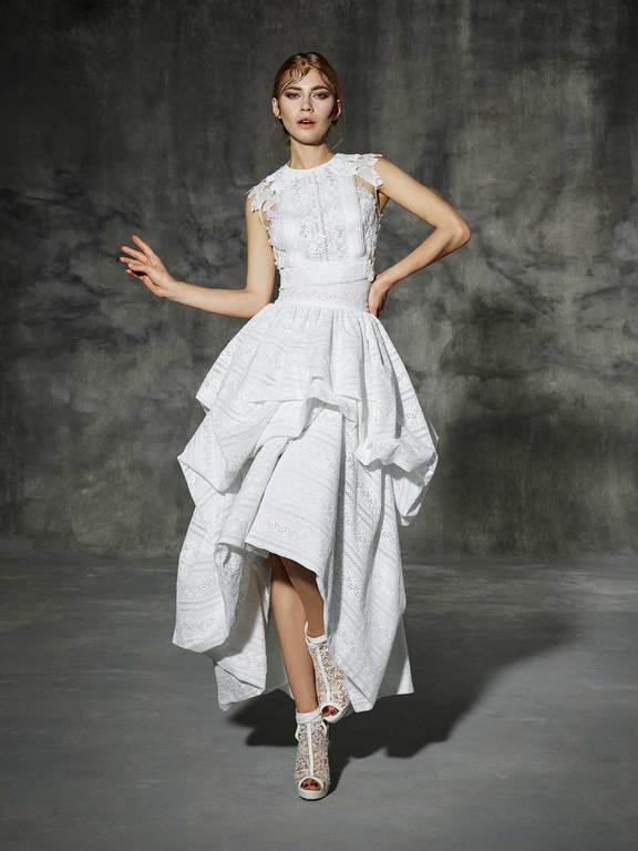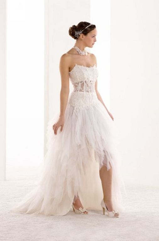Un original vestido corto de silueta globo. Un vestido elegante y espectacular, así es la colección White, para las novias que no quieren renunciar a la tradición de casarse de blanco, pero con un toque moderno, vistiendo un vestido de novia que les haga sentir atractivas, modernas y como toda novia, radiante.
