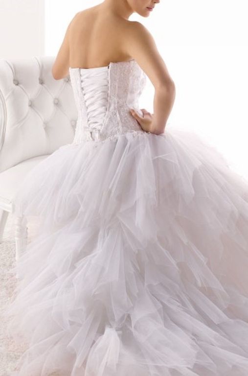 Vestido de novia confeccionado en tejidos naturales. Cuerpo de estilo corsé y con detalles de puntillas, se adapta a nuestra figura gracias a las tiras ajustables de la espalda, que luce prácticamente al desnuda. Un vestido sensual, elegante, femenino y sobre todo muy espectacular. Llama la atención los pequeños y sutiles volantes en la cadera, ofreciendo más volumen y estructura a la falda.