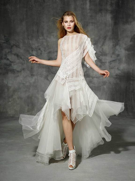 La firma Yolan Cris, nos presenta un original vestido de novia muy moderno. Este look de novia es tan chic por tener un estilo de tendencia Ibicenca, pero llevado un paso más allá, hacia la alta costura. Una sola manga y una falda confeccionada en mullet más corta de delante que de atrás realizada en encaje y tul de seda. Porque un look de novia puede ser moderno y con todas las tendencias de moda.