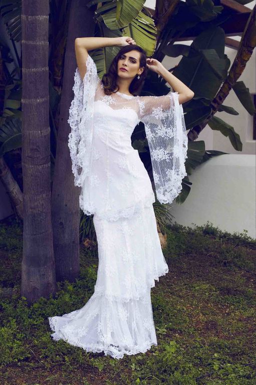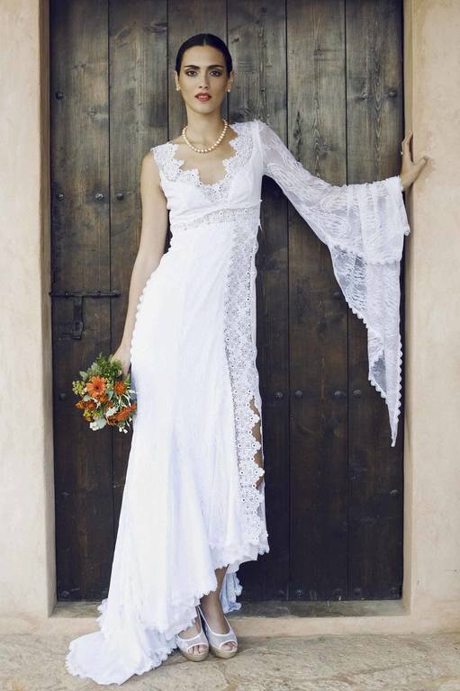 Otro elegante vestido de novia de corte Ibicenco, de manga larga. Vestido confeccionado en blonda, con escote adornado por una bonita puntilla en forma de picos, cuerpo con talle estilo imperio. El detalle de una sola manga saliendo del hombro, tipo bruja y preciosa tira bordada que recorre todo el lateral del vestido. Vestido perteneciente a la colección White de la firma Charo Ruiz.