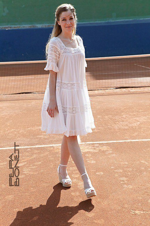 Otro precioso vestido corto de corte ibicenco, confeccionado en satén, encaje y tul. Un vestido de tirantes con escote en V, ajustado a la cintura y falda recta, un vestido sencillo en el que los complementos forman una parte importante para remata nuestro look.