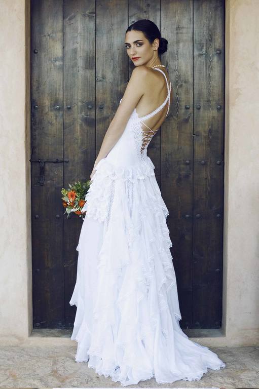 Si la parte delantera de éste vestido es bonita, no podemos obviar la espalda de este maravilloso vestido de novia ibicenco. Tirantes cruzados en la espalda y corsé abrochado mediante cordones, la caída de la cola tan elegante y distinguida hacen de este vestido un sueño hecho realidad.