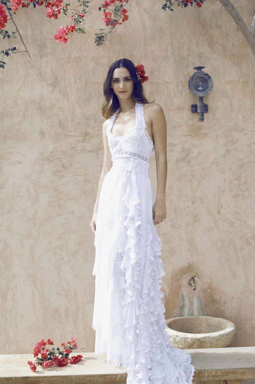 Un precioso vestido ibicenco de la firma Charo Ruiz, un elegante vestido de volantes que recorre toda la falda, con un discreto escote en U, tipo halter. Un vestido adaptable y muy versátil ya que la cola se puede poner o quitar, dándole un aire especial muy provenzal con aroma ibicenco.