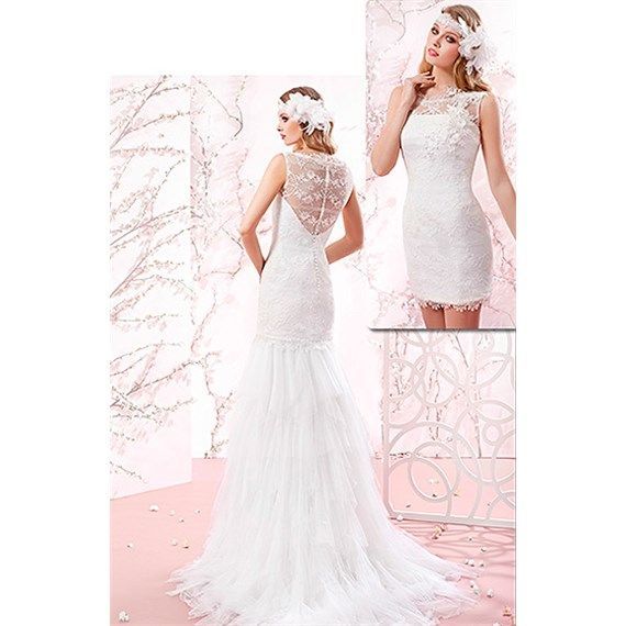 El vestido se completa con un precioso y femenino escote en pico y encajes. Este modelo lleva una peculiaridad y es la posibilidad de poder desprenderse de la falda, cuando el convite así lo requiera ya que se trata de una falda desmontable, haciendo de este vestido una opción maravillosa para una ceremonia al aire libre. Un precioso vestido de inspiración Ibicenca.