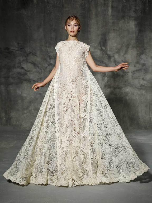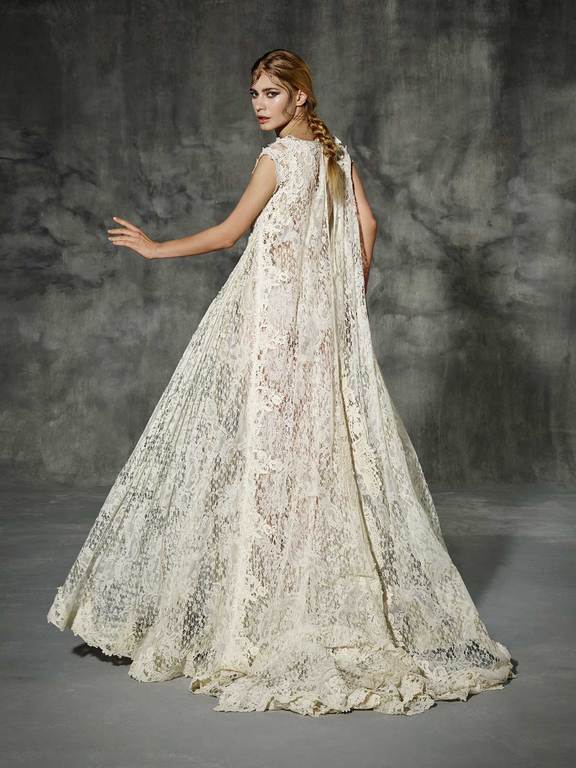 Este fabuloso vestido confeccionado en encajes y tejidos naturales, luce un diseño innovador. Se trata de un vestido amplio, como si de una hermosa capa se tratara. Los encajes utilizados con motivos florales hacen de este vestido una verdadera obra de orfebrería dándole un aspecto muy glamuroso y sofisticado.