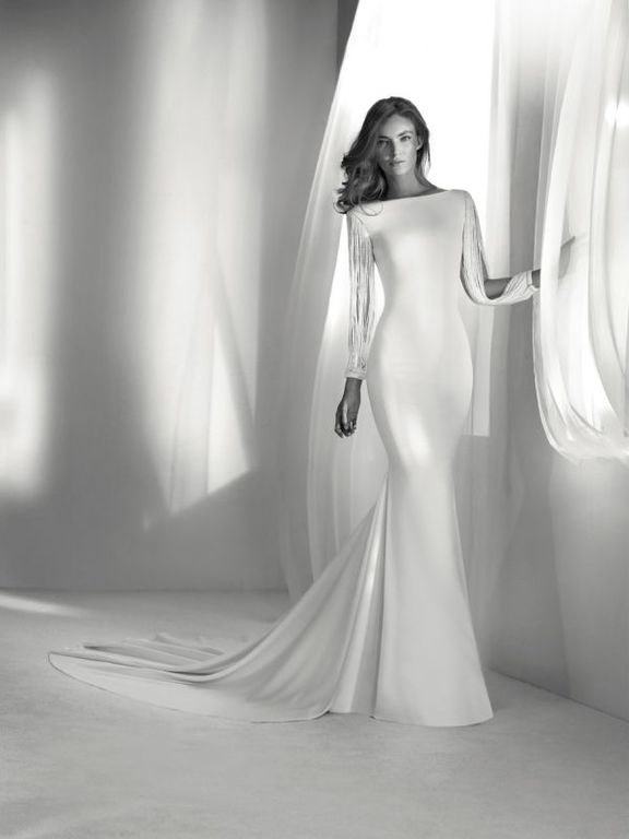 Si quieres otro modelo realmente exquisito de vestido de novia con manga larga y corte sirena, aquí abajo tienes un traje que te enamorará. Es el modelo Relato que trae la firma Atelier pronovias. Con escote en barco y mangas con flecos es un vestido original y único. Además, combina pedrería que darán unos destellos muy especiales en un momento tan mágico.
