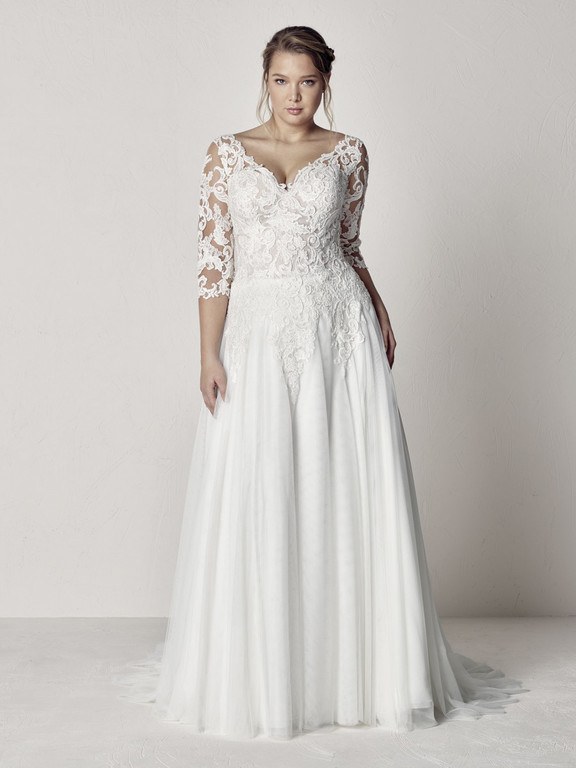 La sencillez de este vestido siempre ha gustado, porque se ve un corte recto que sale de la cintura, para dibujar la figura. Además, gracias a los encajes, se puede logar un efecto muy llamativo, pero de lo más favorecedor. Parecerá que hay dibujos en los brazos con los encajes, haciendo que se vean más estilizados. Este vestido Evette Plus de Pronovias es ideal para disimular esos kilos que pensamos que nos sobran.