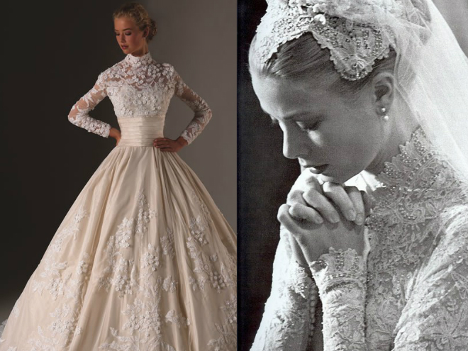 El estilo de Kelly ya era legendario antes de que se casara con un príncipe. Pero su vestido de novia sigue siendo uno de los vestidos más icónicos del siglo XX. Diseñado por Helen Rose, confeccionado en encaje antiguo y tafeta. Este vestido es símbolo de que aunque un vestido tenga muchos detalles, puede ser muy elegante sin pasarse de la raya.