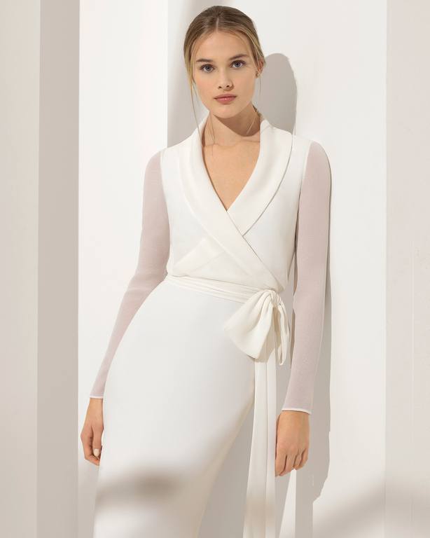 Son muchas las propuestas que podemos encontrar para estas tres líneas pero aquellas que queráis un vestido que os permita lucir elegantes y sin riesgo a equivocaros, nada como decantaros por la línea principal con diseños como el que vemos arriba “Arca ” o este a continuación “Armonia”