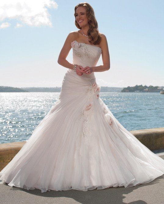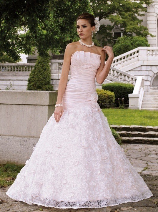 Un escote que triunfa en moda novias, todas las colecciones de novias tienen siempre vestidos con este tipo de escote.En la foto superior diseño en color rosa con escote palabra de honor volante a la altura de la cintura con adorno floral en la cintura. El vestido lleva doble tela rematada en volantes.