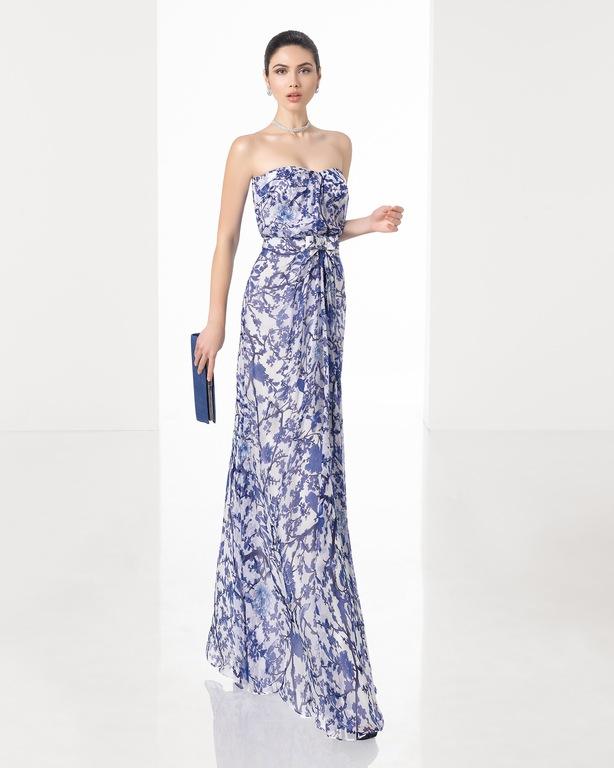 Rosa Clara se decanta por diseños bastante variados al respecto, pero nosotros queremos destacar el modelo “1T1E7“, que cuenta con un estampado de flores muy fresco y sobre un fondo azul que es ideal para una invitada de boda este año. Un diseño además con brocado, escote pico y detalle de cinturón.